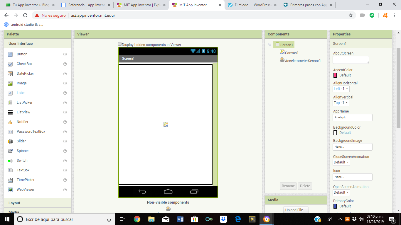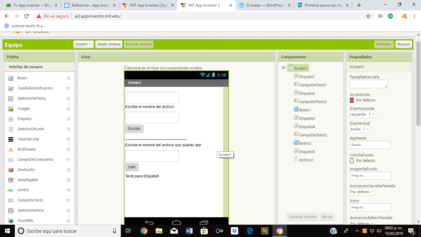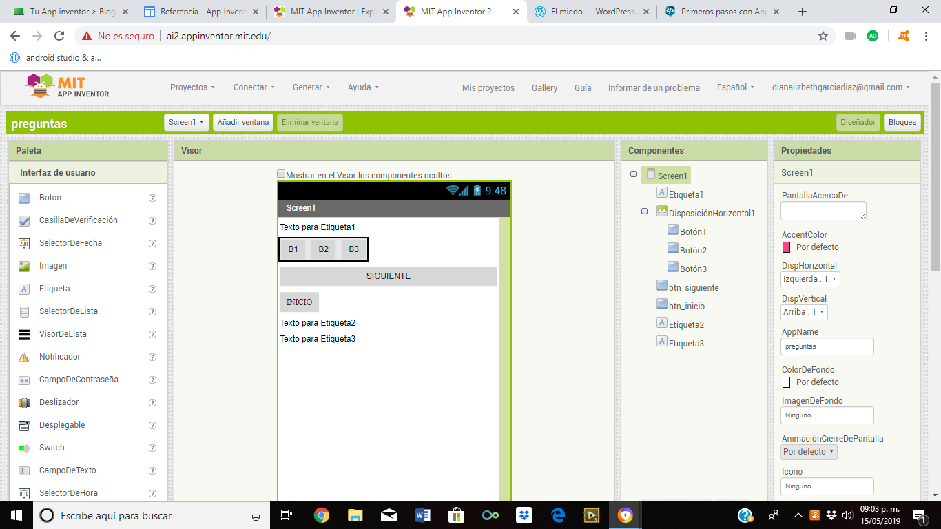 Al construir las aplicaciones para Android trabajarás con dos herramientas: App Inventor Designer y App Inventor Blocks Editor. En Designer construirás el Interfaz de Usuario, eligiendo y situando los elementos con los que interactuará el usuario y los componentes que utilizará la aplicación. En el Blocks Editor definirás el comportamiento de los componentes de tu aplicación.